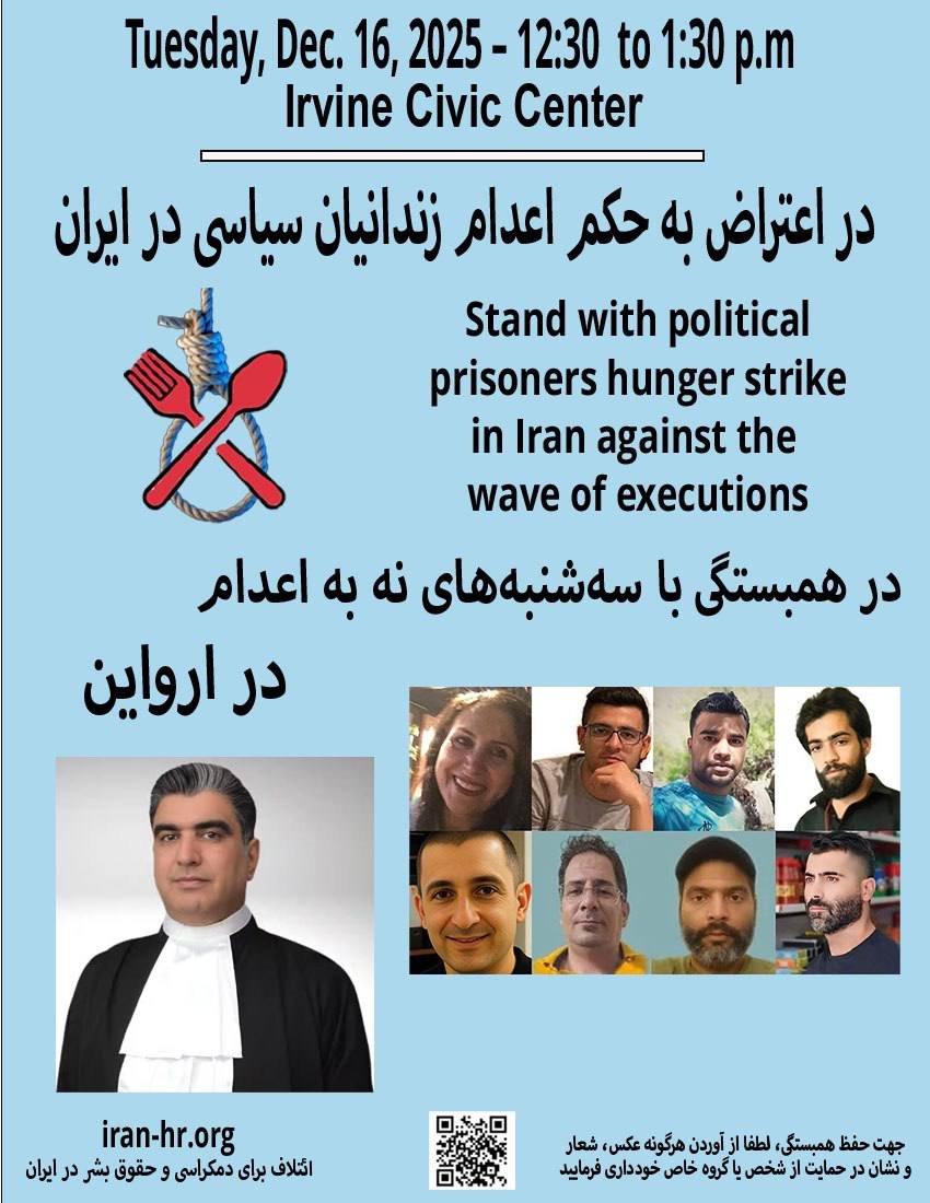 برای حق زندگی، عدالت و کرامت انسانی که بطور روزمره در جمهوری اسلام نقض می‌شود، در تاریخ 16 دسامبر در برابر شهرداری ارواین گرد هم خواهیم آمد تا صدای قربانیان این حکومت باشیم.