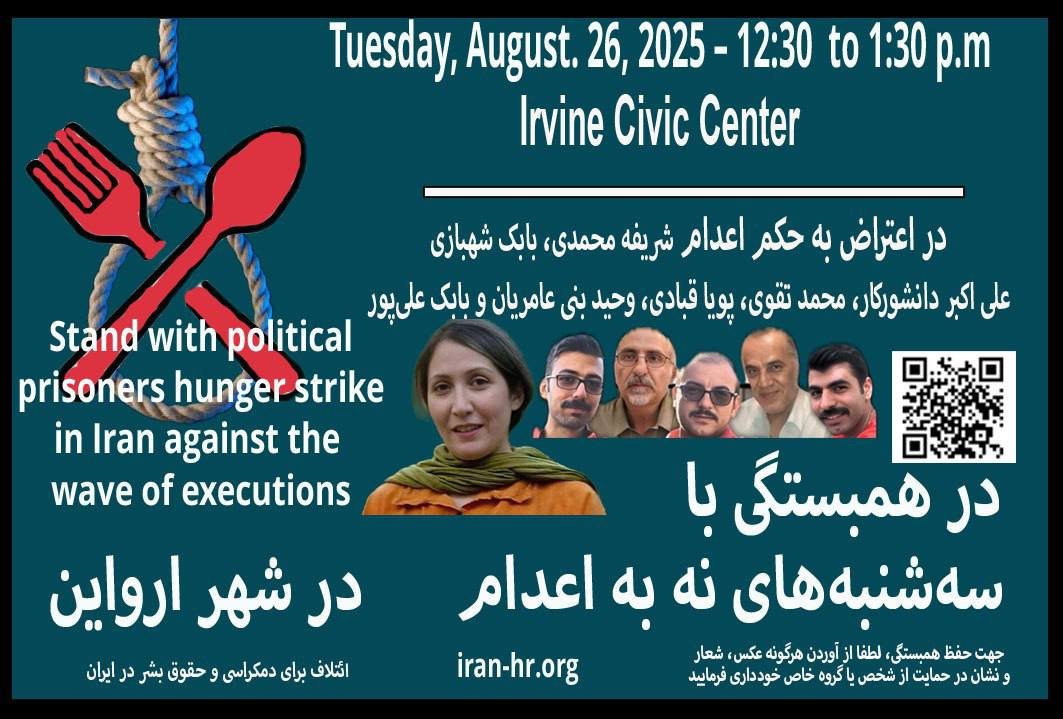 در حمایت از ۸۲مین کارزار “سهشبنههای نه به اعدام” در تاریخ 26 آگوست، ساختمان شهرداری شهر ارواین تجمع کرده تا صدای اعتراض زندانیان سیاسی در ایران باشیم.