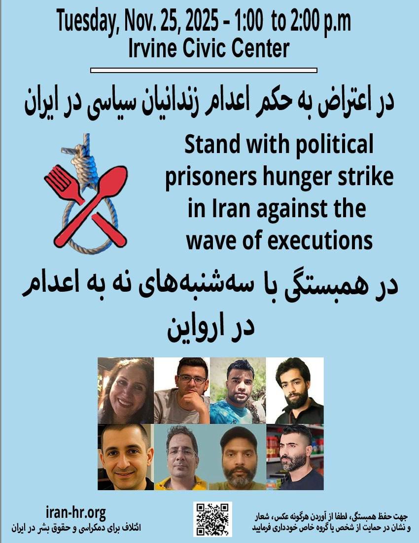 در همراهی با کارزار جهانی «سهشنبههای نه به اعدام» و زندانیان سیاسی که هر سهشنبه در زندانهای ایران دست به اعتصاب غذا میزنند، در روز سهشنبه 25 نوامبر، ساعت 1 تا دو بعد از ظهر در مقابل شهرداری شهر ارواین گرد هم میآییم.